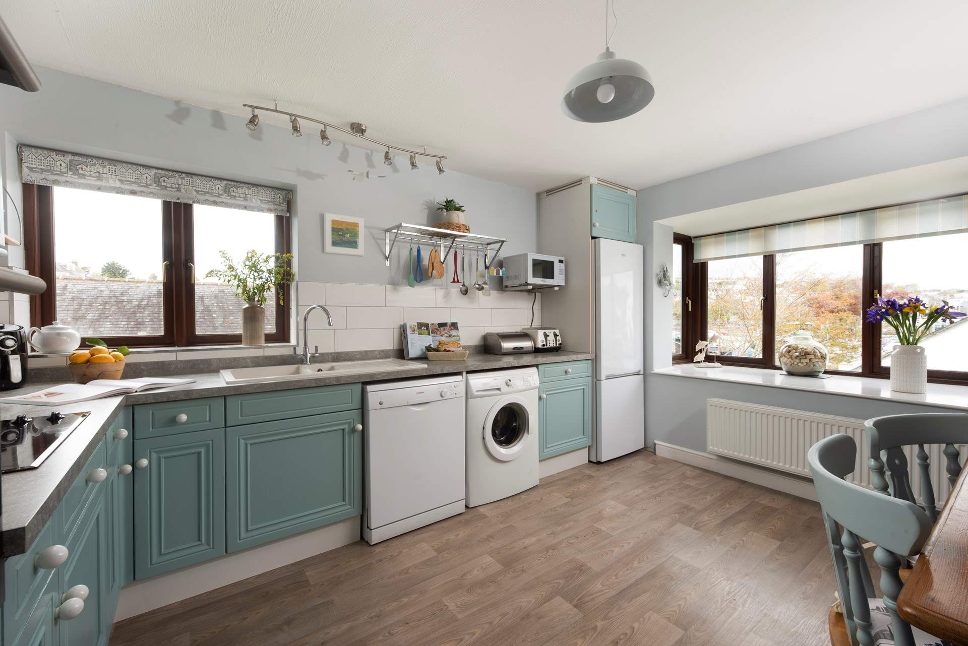 The Anchor is just the perfect size for four people. The first floor apartment is filled with light and you will be greeted by a large entrance hall when you open the front door, leading to your left is the airy and bright sitting-room overlooking pretty communal gardens. Calming coastal tones and hand-made decorations bring the seaside home to this calming sanctuary. The sitting-room has a toasty pebble-effect electric fire which is comforting after a windy coastal walk, perhaps snuggle up with a hot chocolate in front of the fire and watch your favourite film.
